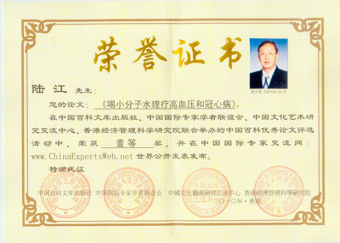 一.發(fā)明的亮點是中國基礎(chǔ)醫(yī)學研究成果的轉(zhuǎn)化醫(yī)學應用------------------------------------------------------------------------------------ 1990年春,我50歲,發(fā)現(xiàn)患了高血壓,便及時遵醫(yī)囑服藥。我想起父輩、祖輩曾患高血壓,后來都患中風癱瘓或心梗過世,所以心中壓力大。我夢想能根治高血壓,便研究醫(yī)學。當我檢索到中國基礎(chǔ)醫(yī)學研究成果,采用高脂餐和磁處理小分子團水飼喂小白鼠或大白免等兩組哺乳動物,經(jīng)過2、4、6個月剖殺血檢,發(fā)現(xiàn)飼喂小分子團水的試驗組動脈內(nèi)壁干凈,能減輕和延緩動脈粥樣硬化。我從這些研究成果受到啟發(fā)。覺得有責任研制出優(yōu)良的器具,讓天下人能真正治愈高血壓,消除動脈粥樣硬化,延年益壽。于是,1990年我做成樣品,先后與愛人飲用兩三個月,分別治愈了高、低血壓,之后我們的血壓都正常,癥狀消失。該水經(jīng)南京大學做核磁共振檢測為55.82赫茲的微小分子團水。該品經(jīng)工業(yè)開發(fā)后,1994年送給廣西三家三甲醫(yī)院做臨床試用4個月,再經(jīng)北京和廣西醫(yī)學專家鑒定認為:“降脂降壓效果好” ,“能擴大心腦動脈流量,改善心腦電圖和微循環(huán)” ,“對治療心腦動脈粥樣硬化、高血壓、高血脂有良好的醫(yī)療保健作用”。1996年產(chǎn)品獲得中國發(fā)明專利權(quán)。這就使產(chǎn)品可以轉(zhuǎn)化為醫(yī)學應用,人類可逐漸改變終生服藥,自己祛除病癥